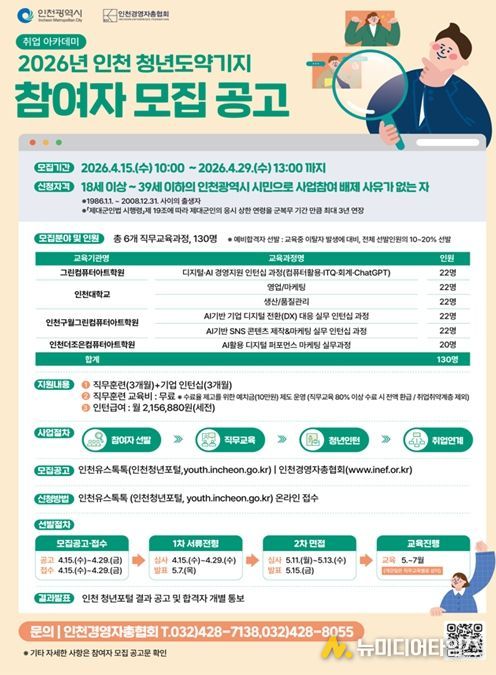 인천광역시는 청년의 취업역량을 강화하고 지역기업이 필요로 하는 실무형 인재를 양성하기 위해 ‘2026 인천 청년도약기지’ 사업 참여자 130명을 4월 15일부터 4월 29일까지 모집한다고 밝혔다.