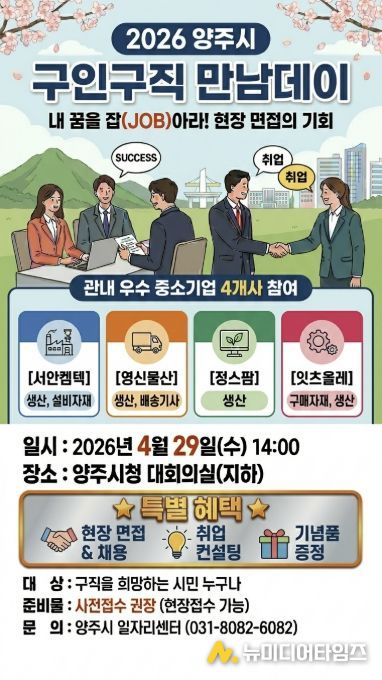 행사는 오는 4월 29일 오후 2시부터 4시까지 양주시청 대회의실에서 진행되며, 구직자는 사전 신청 또는 행사 당일 오후 1시 30분부터 현장 접수 후 면접에 참여할 수 있다. 참여를 희망하는 구직자는 이력서 등 지원 서류를 지참해야 한다.
