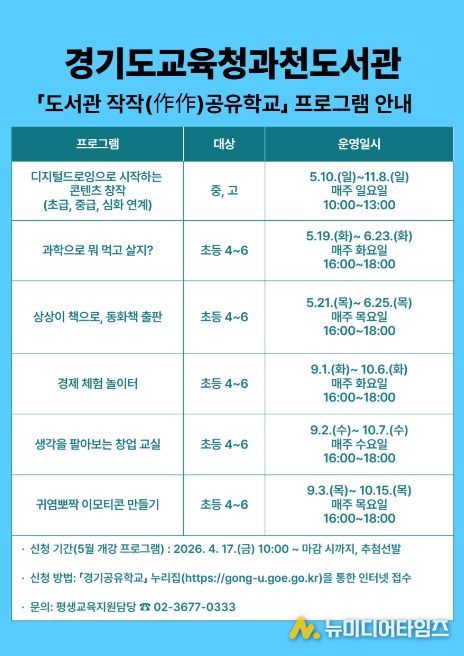조중복 경기도교육청과천도서관장은 “작작(作作) 공유학교는 독서를 기반으로 학생들이 스스로 생각하고 표현하는 경험을 통해 미래 역량을 키우는 프로그램”이라며 “앞으로도 학교와 지역을 연계한 다양한 교육 프로그램을 통해 학생 중심의 배움 환경을 지속적으로 확대해 나가겠다”고 말했다.