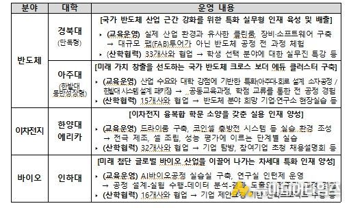 2025년 첨단산업 특성화대학 28개 사업단(38개교)에서는 총 693개의 기업과 함께 총 434건의 교과목(기업 협업 교과목 232건)을 개발·개선하는 등 산업계 친화형 교육과정을 운영하여, 총 3,576명의 인재를 양성했다. 또한, 반도체 팹(FAB) 등 기반 시설을 구축하고 실험·실습 장비를 도입하여 현장 중심 교육 환경을 조성하는 한편, 공동·복수학위 제도 운영 및 교원업적 평가 규정 개선 등 제도 개선을 통해 특성화 분야 교육을 활성화했다.
