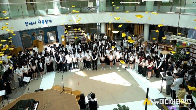 4월 16일 점심시간에 진행된 추모행사에는 전교생과 교직원이 함께 참여했다. 공연예술과 학생들의 추모 시 낭독을 시작으로 묵념, 추모 노래 연주, 추모 공연, 전교생 합창이 이어졌으며, 마지막으로 합창곡 ‘아름다운 사람’을 함께 부르며 행사를 마무리했다. 전교생의 목소리가 하나로 어우러지며 깊은 울림을 전하는 시간이 됐다.
