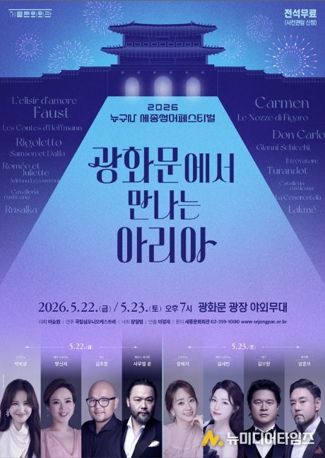세종문화회관은 서울시민 누구나 즐길 수 있는 세종 썸머 페스티벌 '광화문에서 만나는 아리아'를 오는 5월 22일과 23일, 양일간 광화문 광장에서 개최한다. 광화문 광장은 시민 중심의 공간으로 새롭게 거듭난 이후 서울을 대표하는 문화 명소로 자리해 왔으며, 그 중심에서 세종문화회관은 한국 문화예술을 상징하는 공간으로 자리해 왔다. 이러한 공간적 맥락 속에서 세종문화회관과 광화문 광장은 문화의 전통성과 동시대성을 함께 품은 열린 문화예술 플랫폼으로 그 의미를 확장해가고 있다.