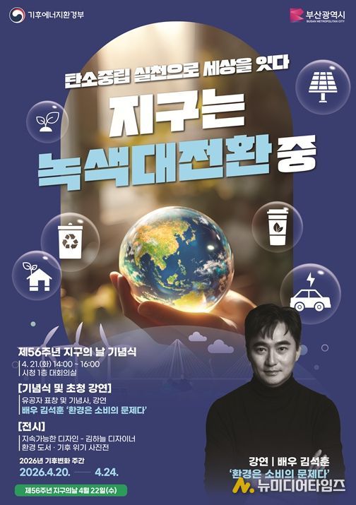 부산시는 '제56주년 지구의 날(4월 22일)'을 맞아 오늘(20일)부터 24일까지 '제18회 기후변화주간'을 운영하고, '지구는 녹색대전환 중. 탄소중립 실천으로 세상을 잇다'를 주제로 다양한 행사를 개최한다고 밝혔다.