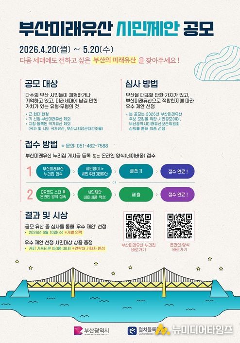 조유장 시 문화국장은 “시민이 제안한 이야기가 곧 부산의 역사가 되고, 그 기억이 미래세대의 자부심이 된다”라며, “우리 주변의 소중한 순간들을 모아 도시의 미래를 더욱 풍성하게 만들겠다”라고 전했다.