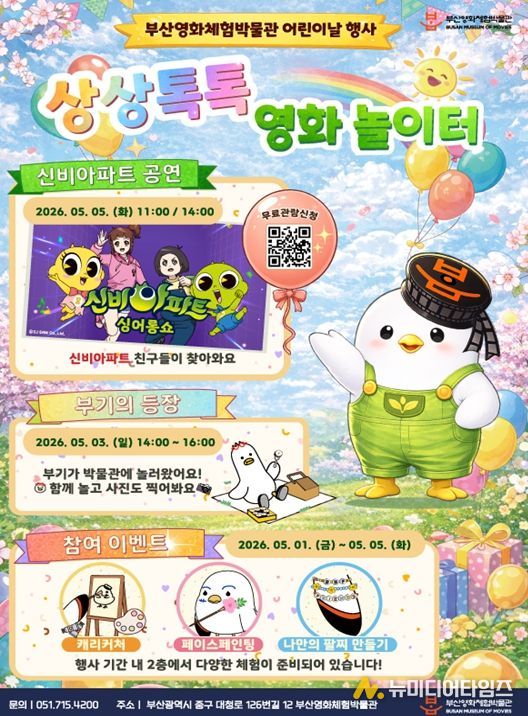 부산시는 부산영화체험박물관(관장 박채성, 중구 소재)에서 어린이날을 맞아 어린이와 가족 관람객을 위한 특별 행사 '상상톡톡 영화 놀이터 : 다 같이 놀자!'를 오는 5월 1일부터 5일까지 5일간 개최한다고 밝혔다.