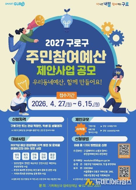구로구가 2027년 예산에 편성할 ‘주민참여예산 사업 공모’를 4월 27일부터 6월 15일까지 진행한다.