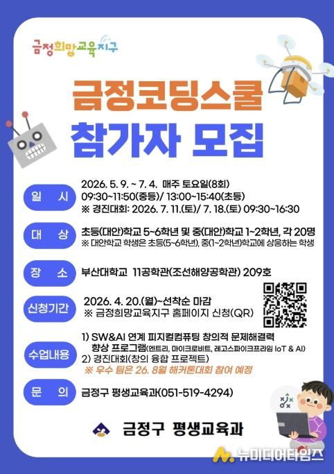 부산 금정구는 초‧중학생을 대상으로 인공지능(AI) 및 소프트웨어(SW) 교육 프로그램인 녪금정 코딩스쿨’을 운영한다고 밝혔다.
