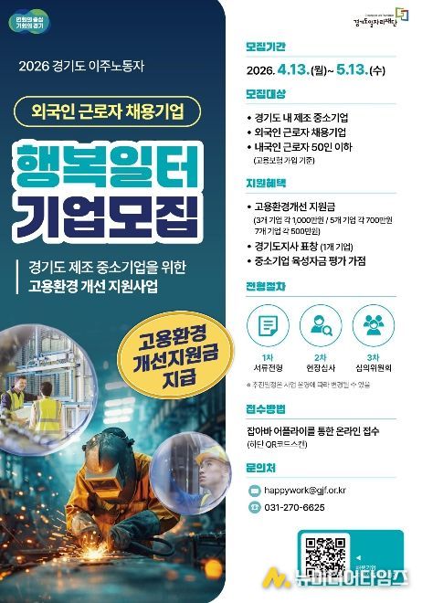 경기도와 경기도일자리재단은 도내 외국인 근로자를 고용한 중소 제조기업을 대상으로 ‘2026년 경기도 이주노동자 행복일터 선정사업’ 참여기업을 모집한다고 20일 밝혔다.
