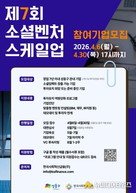 서울 성동구는 관내 소셜벤처기업을 대상으로 투자 유치 역량 강화를 위해 2026년 제7회 소셜벤처 스케일업 프로그램 참여기업을 모집한다고 밝혔다.