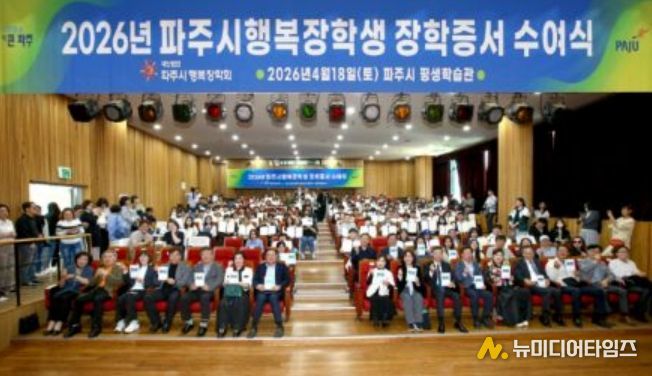 파주시는 (재)파주시행복장학회가 지난 18일 파주시 평생학습관 대공연장에서 학부모와 장학생 등 200여 명이 참석한 가운데 2026년 장학증서 수여식을 개최했다고 밝혔다.