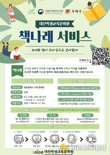 대전학생교육문화원은 봄철 외부 활동이 어려운 장애인과 65세 이상 어르신 등 독서 소외계층의 책 읽는 즐거움을 위해, 비대면 도서 대출 및 반납 서비스인 ‘책나래’ 사업을 4월부터 본격 추진한다고 밝혔다.