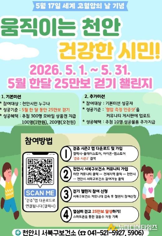 천안시 서북구보건소는 5월 한 달간 ‘움직이는 천안, 건강한 시민!’ 걷기 챌린지를 운영한다고 20일 밝혔다.