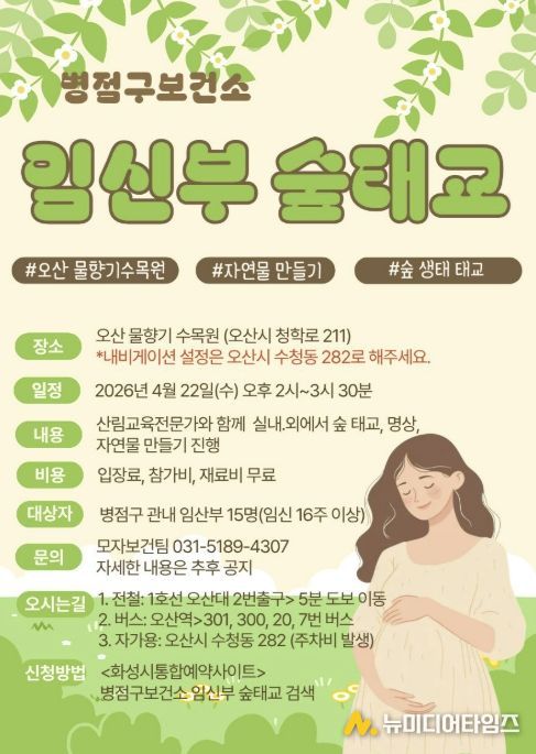 화성특례시 병점구보건소는 임신부의 정서적 안정과 건강한 출산을 지원하기 위해 오는 22일 ‘임신부 숲태교 프로그램’을 운영한다고 밝혔다.