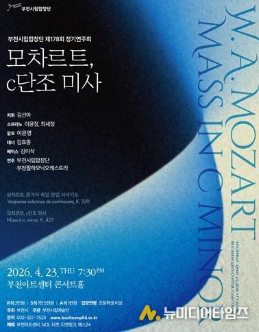 부천시립합창단이 오는 4월 23일 오후 7시 30분 부천아트센터 콘서트홀에서 제178회 정기연주회 ‘모차르트, c단조 미사’를 개최한다. 이번 공연은 김선아 상임지휘자의 지휘 아래 소프라노 이윤정, 최세정, 알토 이은영, 테너 김효종, 베이스 김이삭이 협연자로 무대에 오르며, 부천시립합창단과 부천필하모닉오케스트라, 구민아(오르간)가 함께한다.