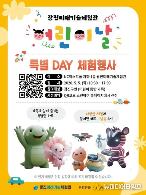 ‘광진미래기술 체험데이’는 5월 5일 오전 10시 30분부터 오후 5시까지 진행되며, 인공지능(AI), 드론, 가상현실(VR) 등 미래 핵심 기술을 직접 체험할 수 있는 참여형 프로그램으로 구성되며, 이를 통해 어린이들이 미래 기술에 대한 꿈과 상상력을 펼칠 수 있도록 할 예정이다.