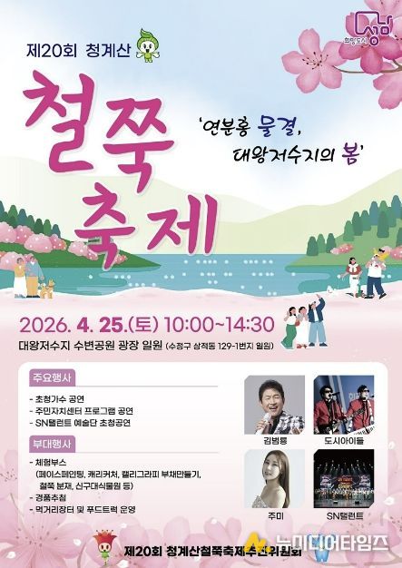 성남시는 ‘제20회 철쭉 축제’가 오는 4월 25일 오전 10시~오후 2시 30분 수정구 상적동 대왕저수지 수변공원 광장에서 열린다고 21일 밝혔다.