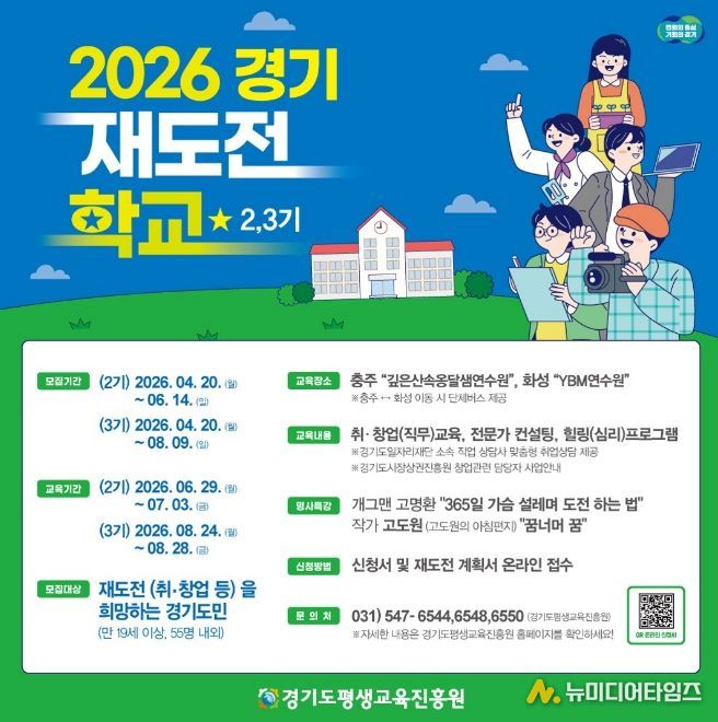 경기도와 경기도평생교육진흥원은 취업이나 창업 실패를 경험한 도민의 재기를 지원하기 위해 오는 20일부터 ‘2026년 경기 재도전학교’ 2~3기 참가자를 각각 55명 내외로 모집한다.