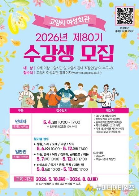 고양특례시 여성회관은 오는 5월 4일부터 12일까지 2026년 제80기 정규강좌 수강생을 모집한다.