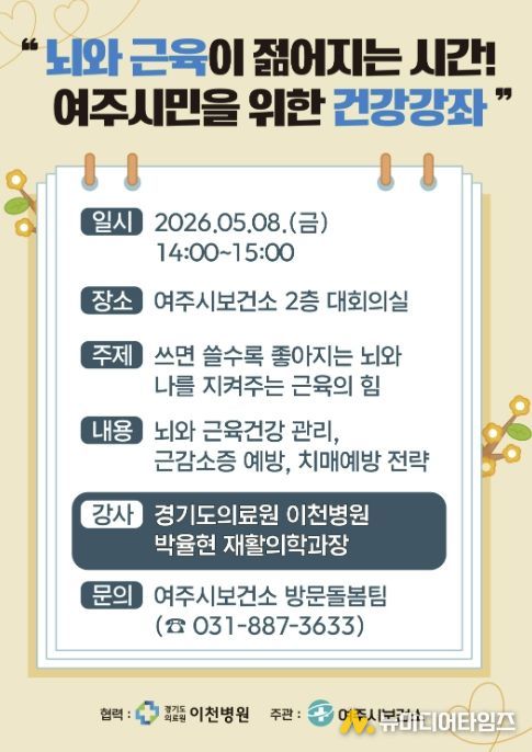 여주시보건소 건강증진과는 오는 5월 8일 오후 2시, 보건소 2층 대회의실에서 여주시민을 위한 건강강좌 '뇌와 근육이 젊어지는 시간!'을 개최한다고 밝혔다.