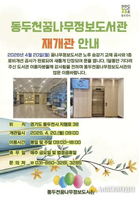 동두천시 도서문화사업소 꿈나무정보도서관은 이용자 편의성과 안전성 강화를 위한 승강기 교체 공사와 1층 로비 환경개선 공사를 마치고 지난 4월 20일부터 재개관했다고 밝혔다.