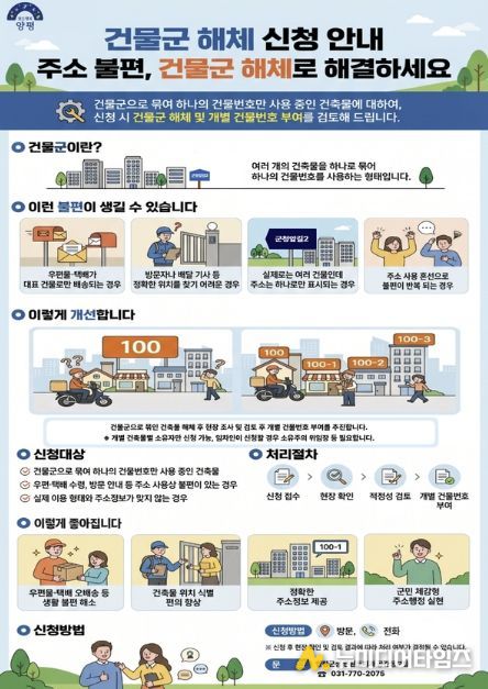 건물군은 여러 개의 건축물을 하나로 묶어 동일한 건물번호를 부여·관리하는 방식이다. 그러나 건물군 내 여러 거주자와 이용자가 있음에도 하나의 건물번호만 사용함에 따라 우편물과 택배, 소포 등이 대표 건물로 집중되는 사례가 발생하고 있다. 이로 인해 등기 반송, 택배 오배송, 방문객 안내 지연 등 생활 속 불편이 지속돼 왔다. 또한 실제로는 서로 다른 건축물임에도 주소상 동일한 건물번호를 사용함으로써 위치 식별이 어렵고, 응급상황이나 안전사고 발생 시 신속한 대응에도 어려움이 있었다.