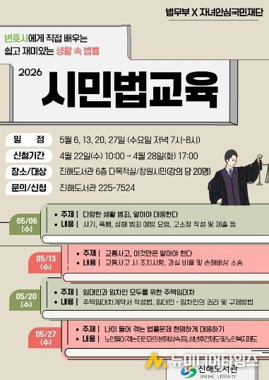 창원특례시 진해도서관(과장 이영화)은 오는 5월 매주 수요일 저녁 7시에 시민의 법률 이해도 향상과 일상 속 법적 문제 대응을 돕기 위해 ‘2026년 시민법교육’을 운영한다고 밝혔다.