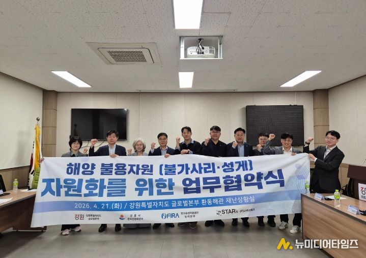 강원특별자치도 제2청사(본부장 손창환)는 4월 21일 강원특별자치도청 제2청사 환동해관에서 강릉시, 한국수산자원공단, ㈜스타스테크와 함께 ‘해양 불용자원 자원화’를 위한 업무협약을 체결했다고 밝혔다.