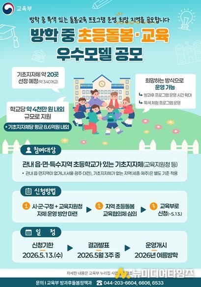 교육부는 4월 22일부터 5월 13일까지 2026년 방학 중 초등돌봄‧교육 우수모델을 운영할 기초지방자치단체 선정을 위한 공모를 실시한다.