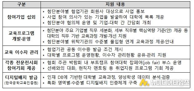 분야별 협업기관은 △참여기업 섭외, △교육프로그램 개발 및 운영, △교육 이수자 관리, △각종 전문 전시회 참여기회 제공 등 사업 운영의 전 단계에서 대학-기업의 교류를 활성화하고, 학생들을 지원하는 역할을 한다. 또한, 대학별 교육과정을 분석하여, 특화 영역별·수준별 디지털 배지 발급을 지원하는 등 인증 체계를 구축하기도 한다.
