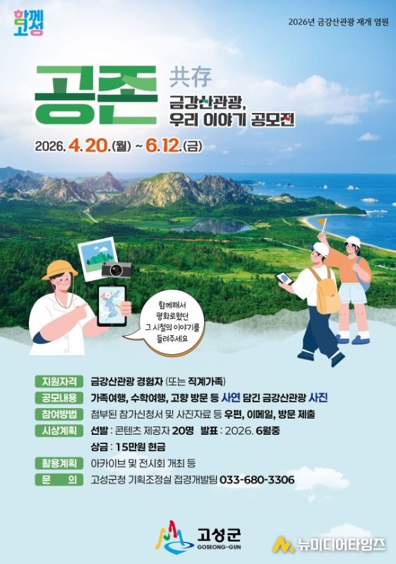 공모 기간은 4월 20일부터 6월 12일까지이며, 금강산관광을 경험한 본인 또는 직계가족이면 누구나 참여할 수 있다. 가족여행, 수학여행, 고향 방문 등 금강산관광과 관련된 사연이 담긴 사진과 이야기를 함께 제출하면 된다. 접수는 전자메일·우편 또는 고성군청 기획조정실 방문을 통해 가능하다. 자세한 사항은 고성군청 누리집 공지사항에서 확인할 수 있다.