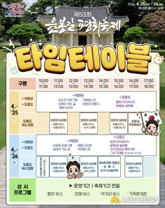 예산군은 ‘제53회 윤봉길 평화축제’를 오는 4월 25일부터 26일까지 덕산면 충의사 일원에서 개최한다고 밝혔다.