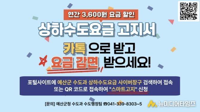예산군은 수도요금을 카카오톡 알림톡으로 간편하게 확인하고 납부할 수 있는 ‘스마트고지 서비스’ 이용을 늘리기 위해 홍보를 강화한다고 밝혔다.