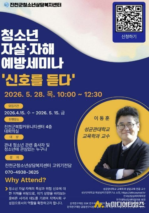 충북 진천군청소년상담복지센터는 오는 5월 28일 진천군복합커뮤니티센터에서 청소년 자살·자해 예방 세미나 ‘신호를 듣다’를 개최한다고 밝혔다.