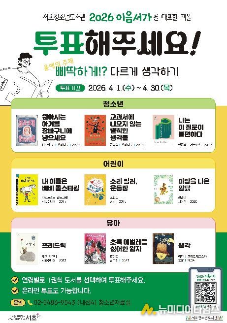 서울 서초구 서초청소년도서관은 주민과 한 권의 책을 선정해 함께 읽고 생각과 경험을 나누는 ‘2026 서청도 한 책 : 이음서가’ 운영을 위해 이달 말까지 올해의 대표 도서 선정 투표를 진행한다.
