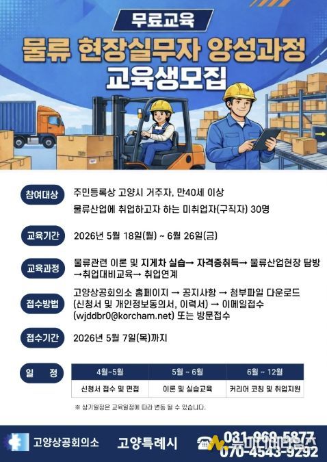 고양특례시는 2026년 고양맞춤형 일자리학교 공모에 선정된 ‘물류 현장실무자 양성과정’에 참여할 교육생을 오는 5월 7일까지 모집한다.