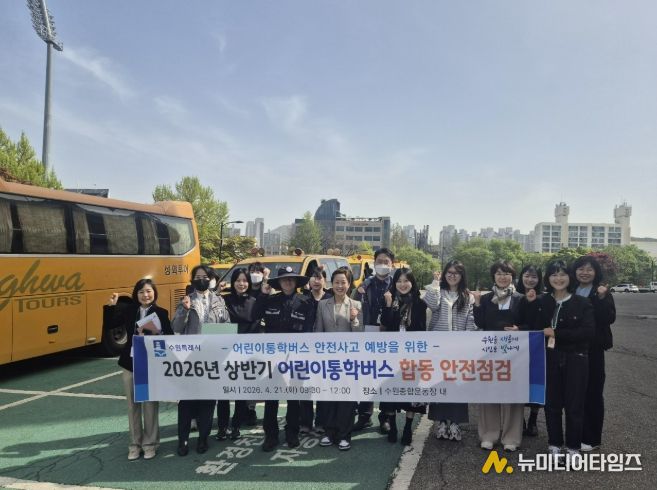 수원특례시는 21일 수원종합운동장 주차구역에서 수원 장안·권선·팔달·영통경찰서, 한국교통안전공단과 함께 ‘2026년 상반기 어린이통학버스 합동 안전점검’을 했다.