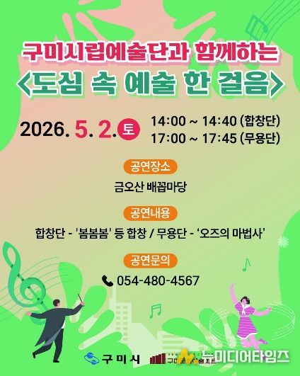 구미시는 가정의 달을 맞아 5월 2일 금오산 배꼽마당에서 구미시립예술단과 함께하는 야외공연 '도심 속 예술 한 걸음'을 개최한다.