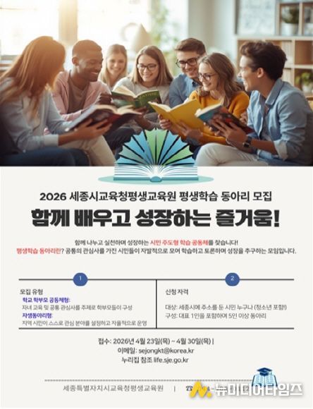 세종특별자치시교육청평생교육원은 시민의 자율적 학습 역량 강화와 지역 학습 공동체 활성화를 위해 ‘2026 평생학습 동아리’에 참여할 공동체를 4월 23일부터 30일까지 공개 모집한다.