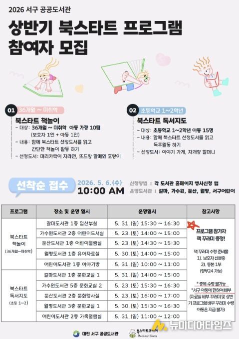 대전 서구 5개 공공도서관(갈마·가수원·둔산·월평·어린이)은 영유아와 어린이들의 건강한 독서 습관 형성을 돕기 위해 2026년 상반기 ‘북스타트 프로그램’을 운영한다.