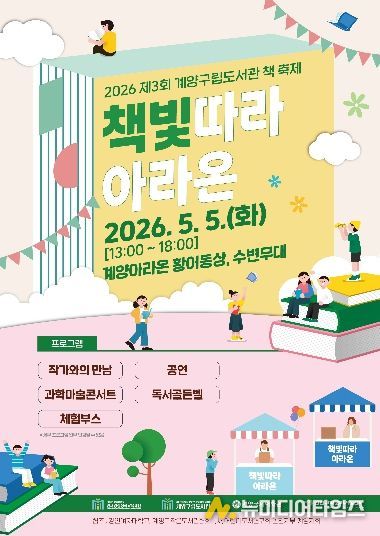 (재)인천광역시계양구인재양성장학교육재단 계양구립도서관은 어린이날인 5월 5일 오후 1시부터 6시까지 계양아라온 황어동상 및 수변무대 일원에서 ‘제3회 계양구립도서관 책 축제 '책빛따라 아라온'’을 개최한다고 밝혔다.