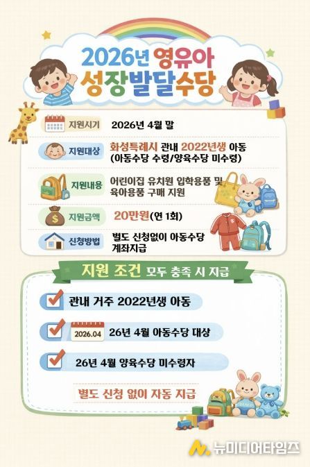 화성특례시는 어린이집 및 유치원 입학 초기 영유아 가정의 양육 부담을 덜고 아동의 건강한 성장을 지원하기 위해 ‘2026년 영유아 성장발달수당’을 지급한다고 밝혔다.