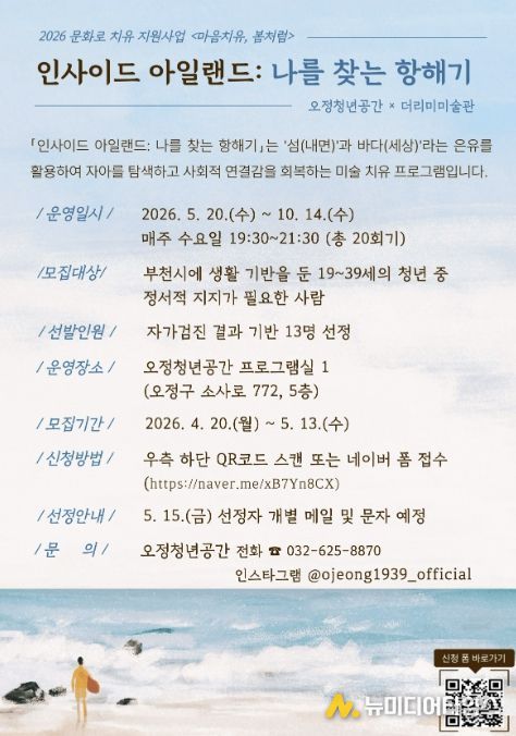 부천시는 오정청년공간에서 정서적 고립감을 겪는 청년을 위한 미술 치유 프로그램 ‘인사이드 아일랜드: 나를 찾는 항해기’ 참여자를 5월 13일까지 모집한다.