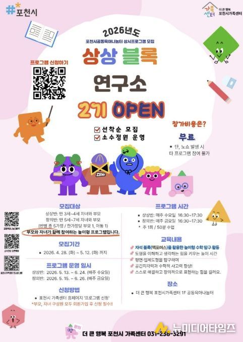 최선희 포천시가족센터장은 “상상블록연구소 1기에 보내주신 높은 관심과 참여에 감사드린다”며 “2기에서는 연령별 맞춤 운영을 통해 더 많은 가정이 함께할 수 있도록 준비한 만큼, 관심 있는 가정의 많은 참여를 바란다”고 전했다.