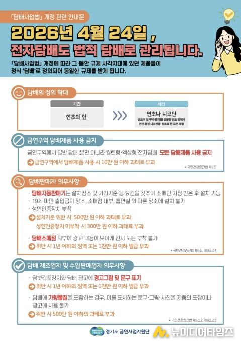 이번 점검은 2026년 4월 24일부터 시행되는 '담배사업법' 개정에 따른 조치로, 액상형 전자담배 등 신종 담배 제품이 처음으로 본격적인 법적 관리 대상에 포함되면서 점검 범위가 크게 확대됐다.