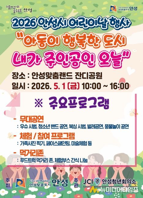 “아동이 행복한 도시, 내가 주인공인 오늘!”을 슬로건으로 내건 이번 행사는 5월 1일 오전 10시부터 안성맞춤랜드 잔디광장 일원에서 화려하게 펼쳐진다. 특히 바쁜 일상 속에서 놓치기 쉬운 소중한 추억을 선사하기 위해 부모와 아이가 함께 호흡할 수 있는 참여형 프로그램 위주로 구성됐다.