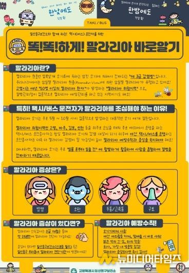 고양특례시 일산동구보건소는 말라리아 매개모기가 본격적으로 활동하는 시기를 대비해 택시와 버스 등 운전 종사자들을 대상으로 “똑!똑!하!게! 말라리아 바로알기”를 오는 5월부터 홍보할 예정이라고 밝혔다.