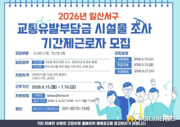 고양특례시 일산서구는 ‘2026년 교통유발부담금 시설물 전수조사’ 실시를 위해 오는 5월 6일부터 보조원 23명을 모집한다.
