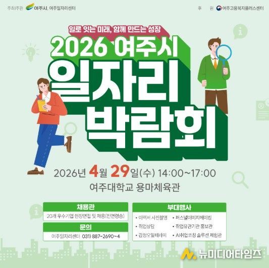 여주시는 오는 4월 29일 오후 2시부터 5시까지 여주대학교 용마체육관에서 2026 여주시 일자리박람회를 개최한다고 밝혔다.