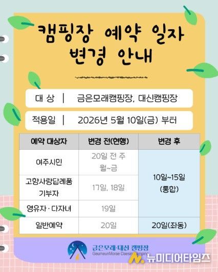 여주도시공사는 오는 5월 10일부터 이용자 중심의 고품질 서비스 제공을 위해 금은모래캠핑장, 대신캠핑장의 온라인 통합예약 일정을 대폭 간소화한다고 밝혔다.