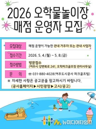 여주도시공사는 2026년 오학물놀이장 운영을 앞두고 이용객 편의 제공을 위한 매점 운영자를 공개 모집한다고 밝혔다.
